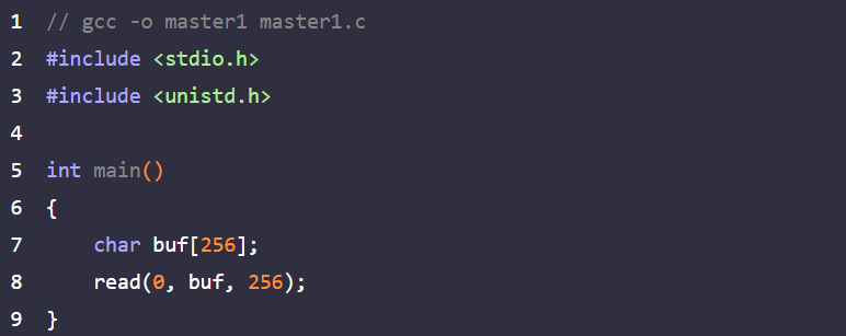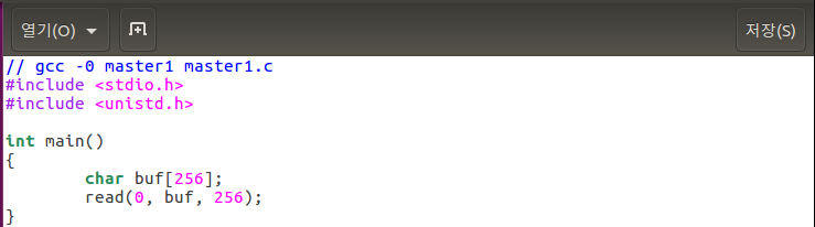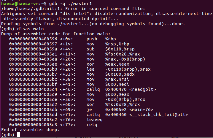다음 예제는 master1.c이다. 해당 예제는 SSP 보호기법이 적용되어 있고 지역 변수를 사용하므로 main 함수에서 카나리를 삽입하고 검사하는 루틴이 존재한다.