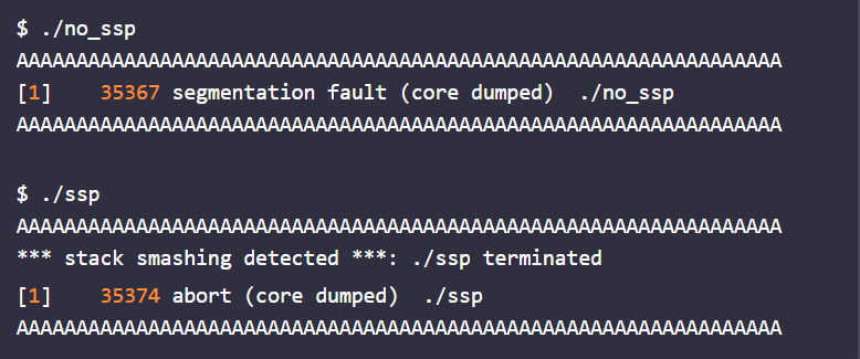 두 바이너리에 각각 buf 배열의 사이즈보다 긴 값을 인자로 전달해 스택 버퍼 오버플로우 취약점을 트리거해보겠다. no_ssp 바이너리의 경우 Segmentation fault 예외가 출력되며 프로그램이 비정상 종료되는 반면, ssp 바이너리는 __stack_chk_fail 함수가 호출되어 "stack smashing detected" 문자열을 출력하며 프로그램이 종료된다.