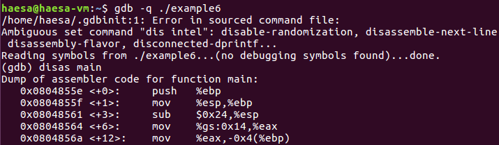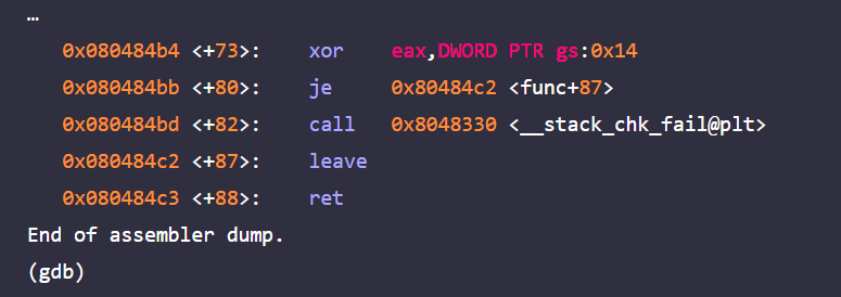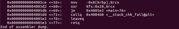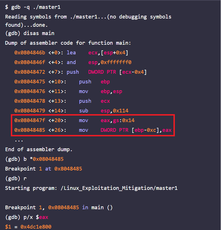 master1.c를 gdb로 디버그 해보면 gs:0x14에서 카나리를 얻어와서 $eax에 저장하고, $eax 값을 다시 ebp아래 영역에 저장하는 것을 알 수 있다.