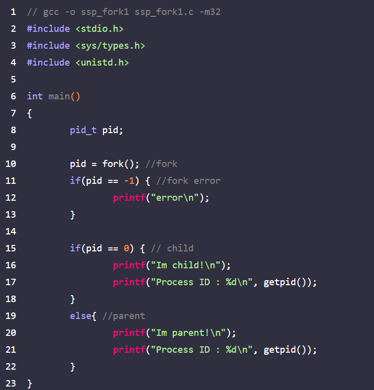 ssp_fork1.c는 fork 함수를 사용하여 자식 프로세스를 생성하는 코드이고, fork 함수는 부모 프로세스의 TLS 영역과 스택 메모리 등을 복제해 자식 프로세스를 생성한다.