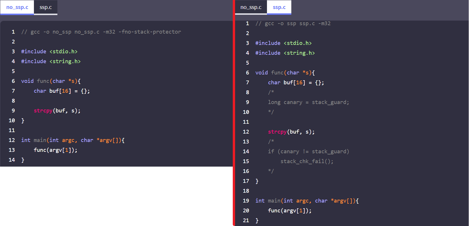 다음은 ssp적용 여부에 따른 디스어셈블리 결과를 확인해보겠다. 왼쪽은 ssp를 적용시키지 않고, 오른쪽은 ssp를 적용시켜 컴파일한다.