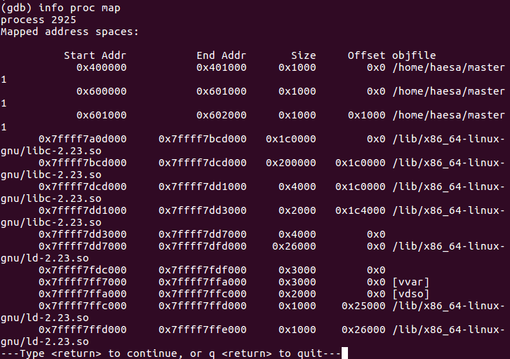 PIE 보호기법을 우회하기 위해서는 코드 영역의 주소를 알아내야 한다. PIE 보호기법이 설정되어 있을 때 코드 영역은 공유 라이브러리처럼 메모리에 로딩되기 때문에 libc.so.6 라이브러리 주소를 구하는 과정과 같이 특정 코드 영역의 주소를 알아낸다면 코드 영역 베이스 주소를 구할 수 있다. 코드 영역 베이스 주소를 구한다면, 오프셋 계산을 통해 코드나 데이터 영역의 주소를 구할 수 있다.