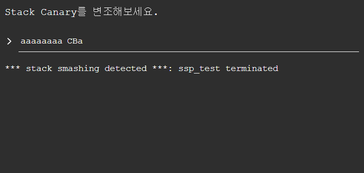 반면 stack_canary 영역의 값을 조금 바꿔주면 __stack_chk_fail() 함수가 실행되면서 다음과 같은 문자열이 출력된다.