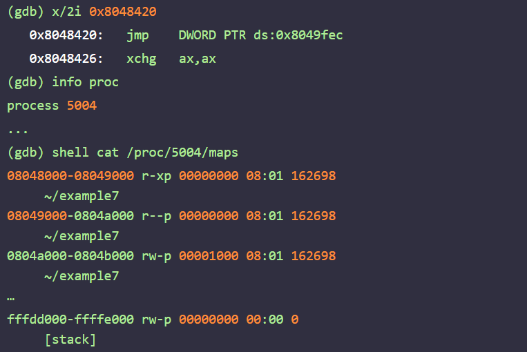 다음은 2번 메뉴의 기능인 arbitrary write를 통해 실행 흐름을 조작할 수 있다. example7의 메모리 권한을 보면 GOT에 쓰기 권한이 없다. 하지만 RELRO 보호기법이 적용되어 있더라도 스택 등 동적으로 데이터를 써야 하는 메모리에는 여전히 쓰기 권한이 있다. 2번 메뉴를 이용해 스택 메모리에 값을 쓰려면 스택의 주소를 알아야 한다.