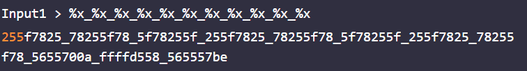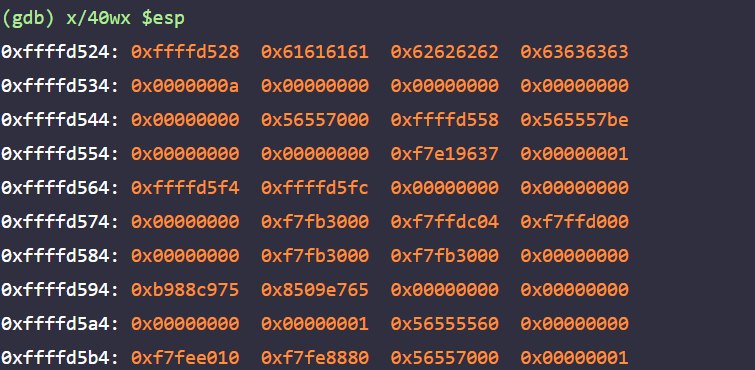 0x565557be는 vuln 함수의 리턴 주소, 즉 main+66의 주소이다. 포맷 스트링 버그를 이용하면 0xffffd550에 있는 값을 출력시킬 수 있다. 0x61616161이 저장되어 있는 0xffffd528이 첫 번째 포맷 스트링에 대한 인자 위치이므로 11번째 포맷에서 스택에 저장된 0x565557be를 출력시킬 수 있다.