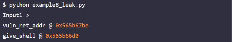 example8_leak.py는 give_shell 함수의 주소를 구하는 파이썬 스크립트이고, 스크립트를 실행하면 다음과 같이 give_shell 함수의 주소가 출력됨.