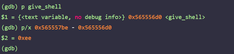 이 주소를 이용해 give_shell의 주소를계산할 수 있다. give_shell 함수의 주소는 0x565557be - 0xee