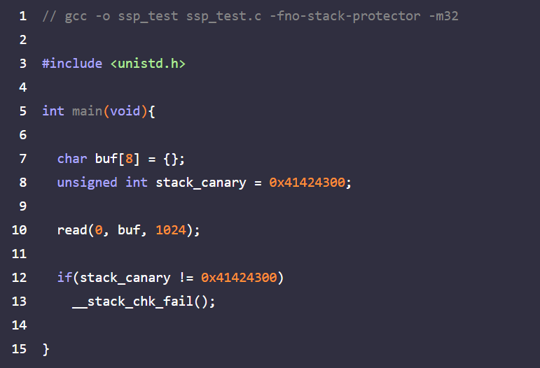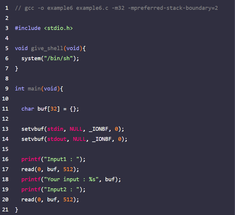 SSP 보호기법을 우회하기 위해선 스택 메모리에 존재하는 스택 카나리의 값을 변조시키지 않은 채로 익스플로잇을 해야한다. 다음 example6.c 예제를 가지고 실습해보겠다.