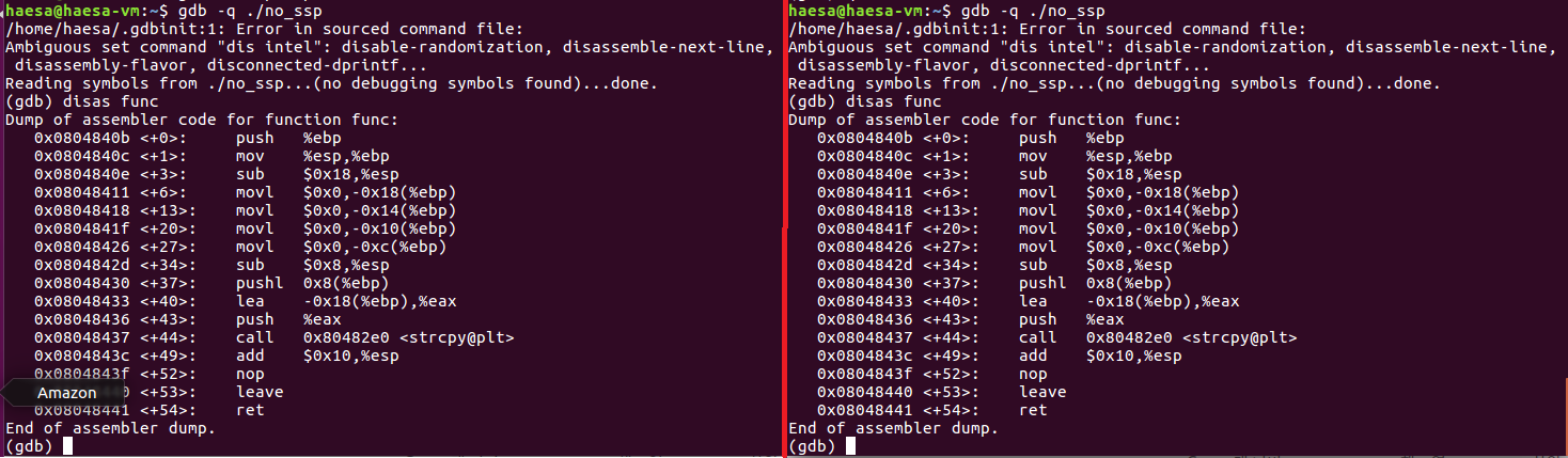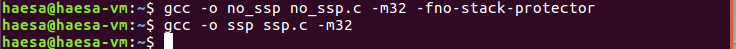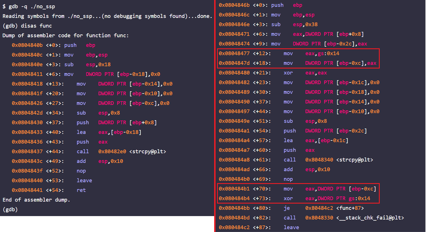 왼쪽은 no_ssp 디스어셈블리 결과이고, 오른쪽은 ssp 디스어셈블리 결과다. 왼쪽과 달리 오른쪽은 함수의 프롤로그와 에필로그에 스택 카나리 검증 루틴이 추가됐다. 함수 프롤로그에서 생성된 카나리를 $eax에 담고 ebp 아래 영역에 저장한다. 에필로그에는 ebp 영역 아래 저장된 카나리를 $eax에 옮기고 gs:0x14와 비교해서 스택의 변조 여부를 검사한다.