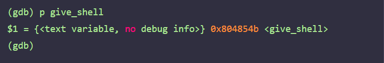 이제는 구한 스택 카나리 값을 이용해 main 함수의 2번째 read 함수에서 스택 버퍼 오버플로우를 익스플로잇할 수 있다. gdb를 이용해 give_shell 함수의 주소를 구한 후 리턴 주소를 give_shell 함수의 주소로 덮어 셸을 획득하자.