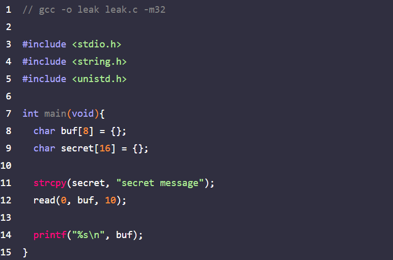 다음 dreamhack의 leak test를 진행해보자. 아래는 leak.c 코드다. buf에 입력을 통해 secret 버퍼의 내용까지 출력해야 한다. 앞서 설명한 내용에 %s 포맷스트링은 NULL 바이트를 만나기 않으면 buf 배열 밖의 메모리까지 출력할 수 있다고 했다. 마침 leak.c에도 %s 포맷스트링이 사용되고 있다. buf의 크기에 딱 맞게 입력을 주면 buf 다음 메모리인 secret 배열의 내용도 같이 출력된다.