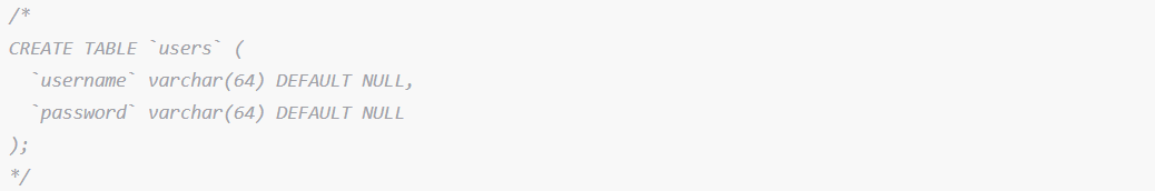 소스코드 위쪽에 주석이 하나 있는데 DB의 구조를 보여주고 있다. user라는 테이블에 password column이 있는 것을 확인했다.