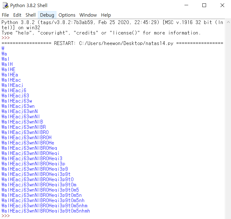 위의 코드를 실행하면 다음과 같이 natas16의 password를 알아낼 수 있다.