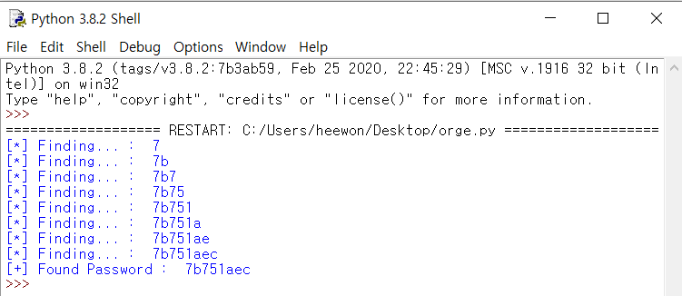 orge를 풀기위한 자동화 프로그램은 다음과 같다. (pw의 길이는 8)