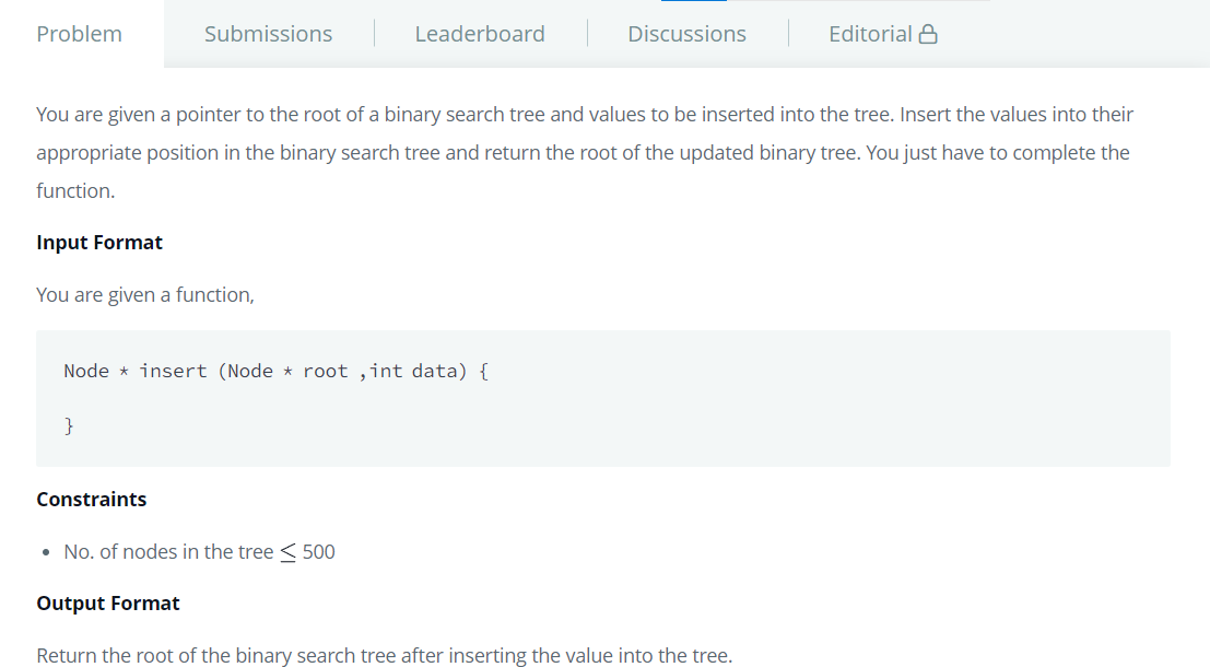 root가 NULL이라면 empty tree이므로 root에 node를 추가한다.NULL이 아니라면 트리를 따라 맨 아래로 내려간다.temp를 사용해서 노드를 탐색하는데 새로 추가 할 노드의 data가 더 작으면 left, 더 크면 right로 이동한다.같다면 중복이므로 NULL을 return한다.temp가 NULL이라면 트리의 맨 아래까지 왔다는 뜻이므로 do-while문을 빠져나오고 prev의 자식에 node를 추가한다.data가 prev의 data보다 작으면 left, 크면 right에 추가한다.모든 과정이 끝나면 root를 return한다.