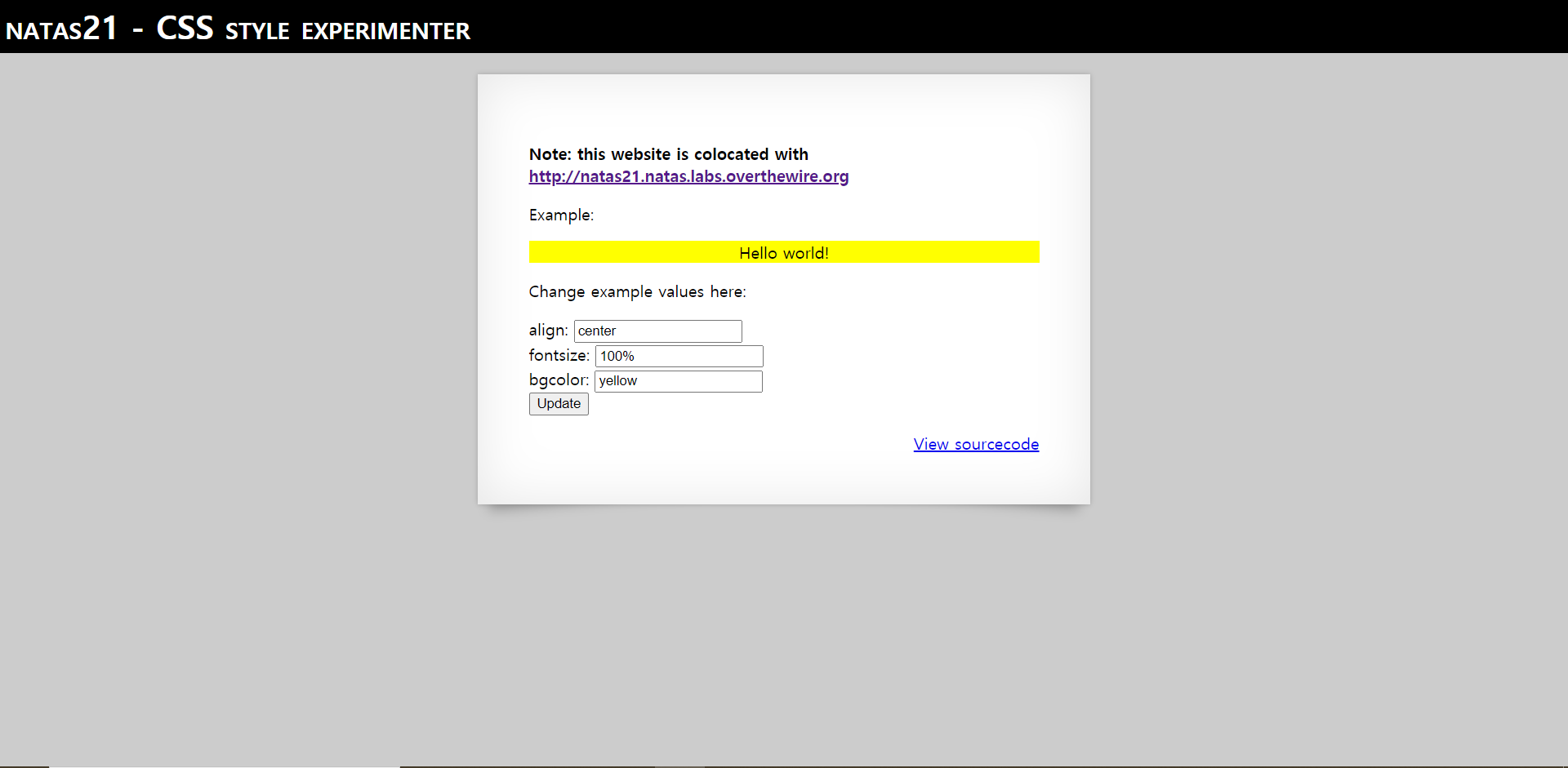 <link rel="stylesheet" href="http://natas.labs.overthewire.org/css/wechall.css" />