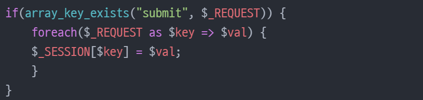 해당 소스코드는 세션에 새로운 key => value값을 추가할 수 있는 코드다. 이를 이용하면 admin 세션을 추가할 수 있다.