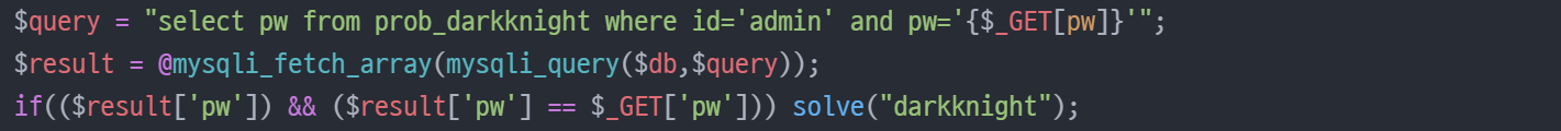 GET방법으로 전달하는 pw가 admin의 pw와 같아야 하므로 우리는 admin의 pw를 알아내야 한다.