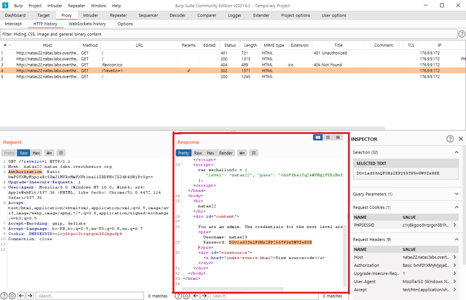 burp suite를 사용하면 새로운 페이지로 넘어가기 전 natas23의 password가 출력된 response를 가로챌 수 있다.