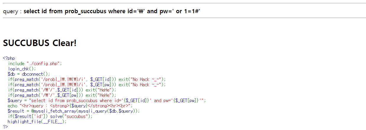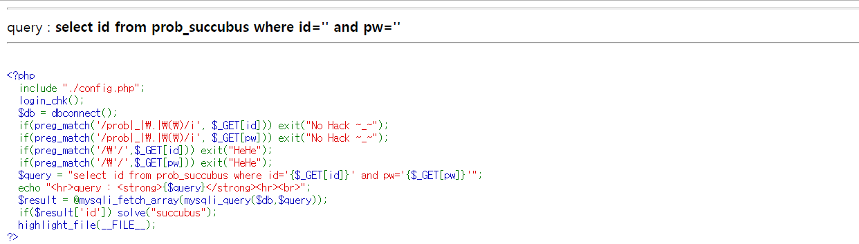 succubus 화면이다. id와 pw를 query에 삽입하고 있고 prob, _, ., (, ), '를 필터링하고 있다.