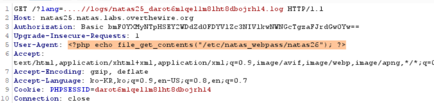 따라서 lang에 /var/www/natas/natas25/logs/natas25_" . session_id() .".log를 전달해서 include하고, user agent를 burp suite로 변조해서 natas_webpass/natas26의 데이터를 불러온다.