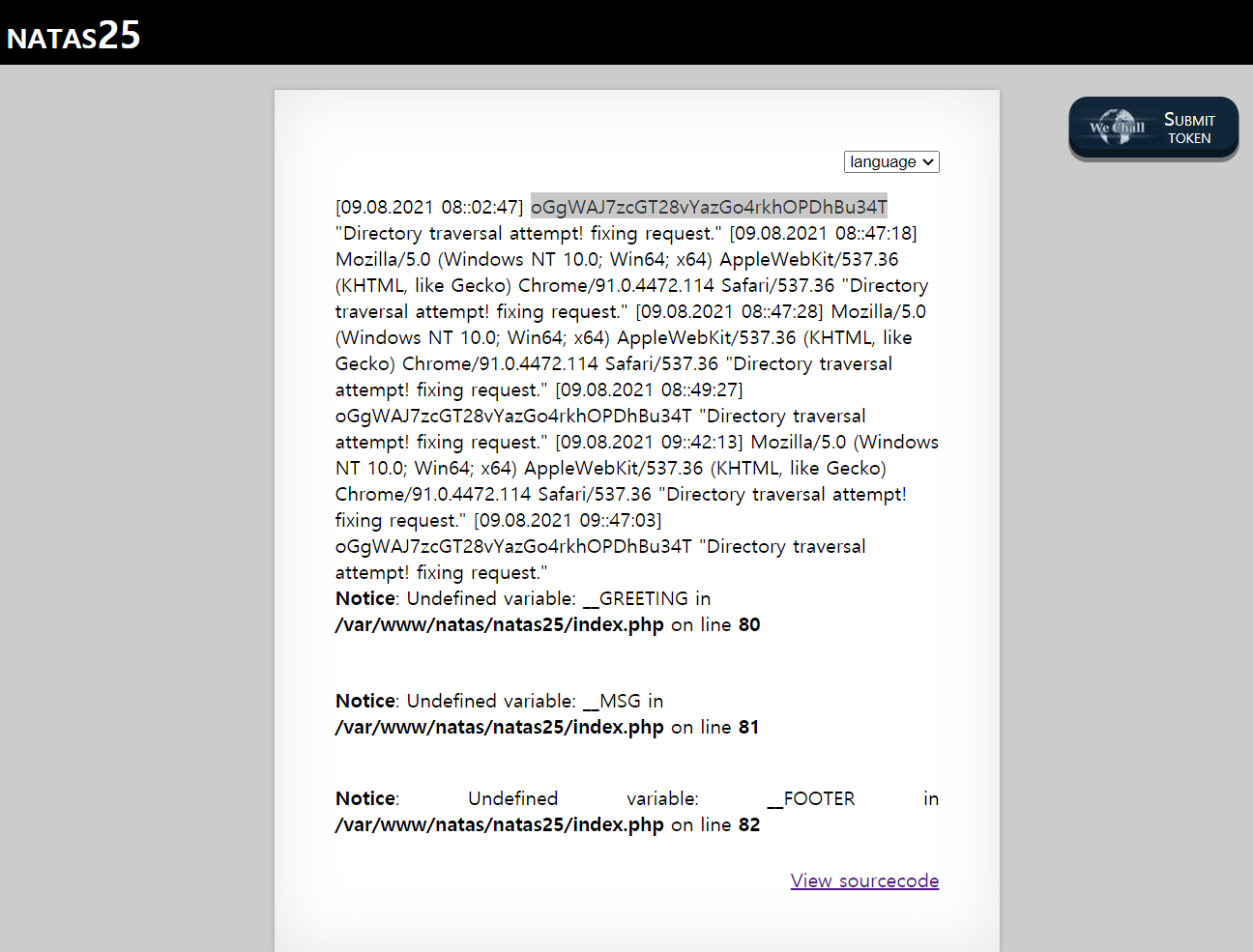 natas25 화면이다. 어떤 글귀와 language 선택 박스가 있다. 바로 소스코드를 확인해보자.