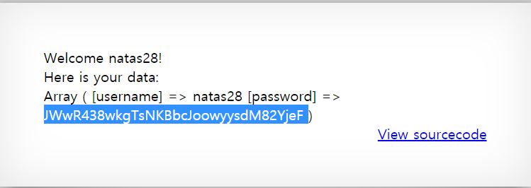 natas28 password: JWwR438wkgTsNKBbcJoowyysdM82YjeF