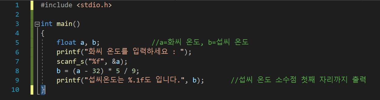 입력 받는 화씨 온도와 출력 되는 섭씨 온도는 모두 실수형 변수이다.