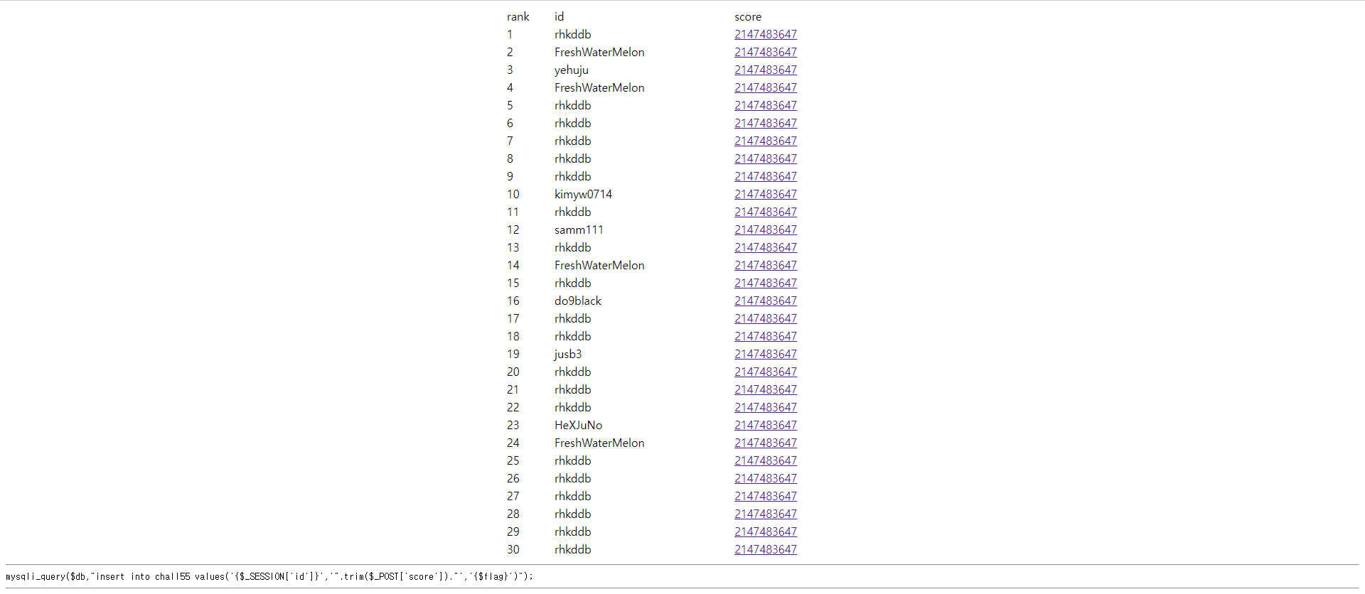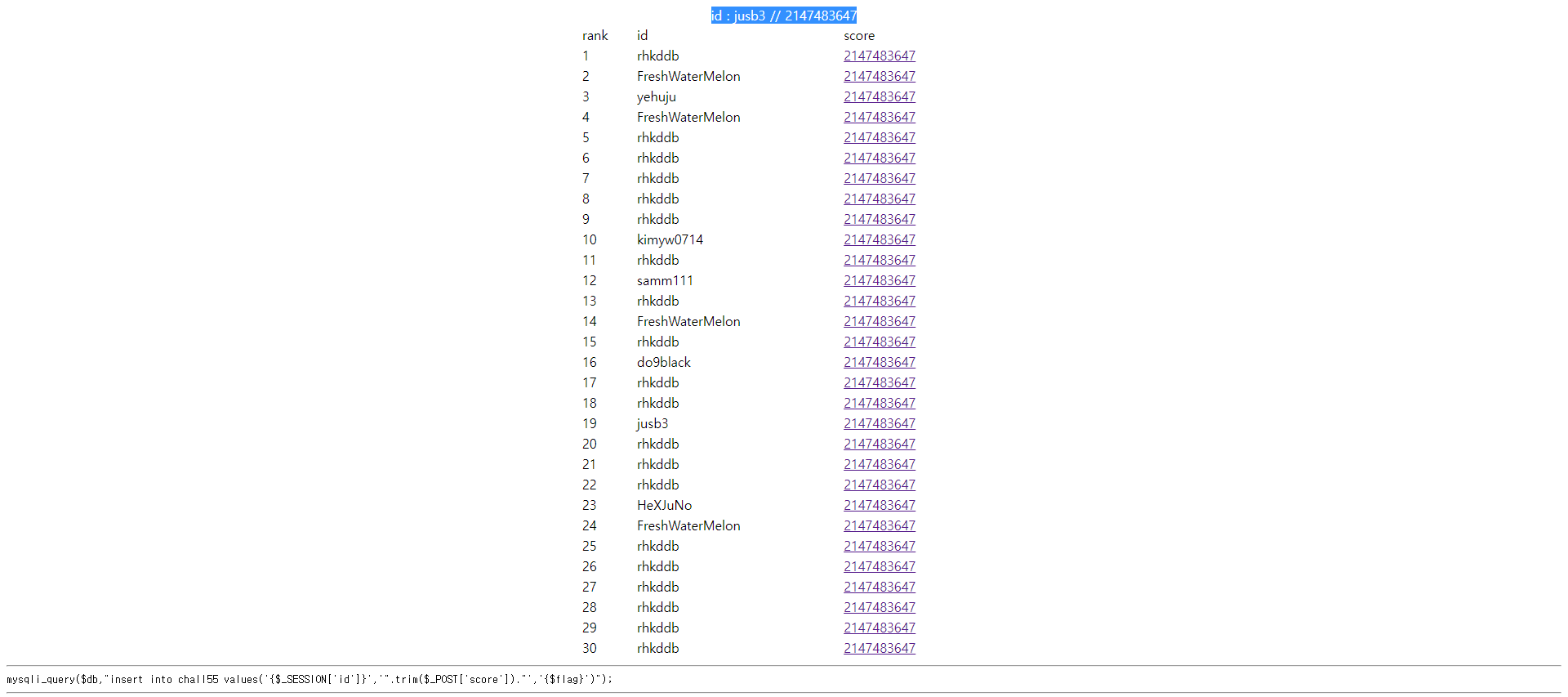 mysqli_query($db,"insert into chall55 values('{$_SESSION['id']}','".trim($_POST['score'])."','{$flag}')");