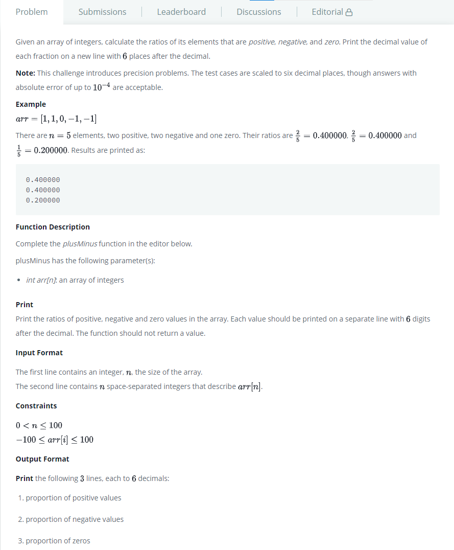 배열 원소들의 양수, 음수, 0의 비율을 구하는 문제다. (단, 소수점 아래 6자리까지 구해야함.)