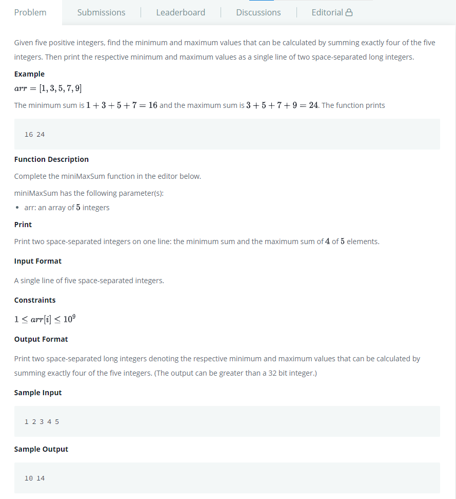 원소가 5개인 배열에서 4개의 합이 가장 작은 것과 가장 큰 것을 출력하는 문제다.