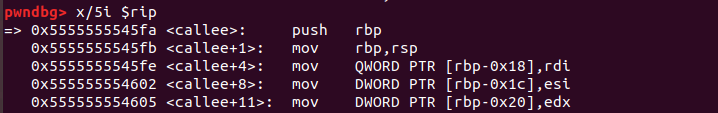 x/5i $rip 명령어로 callee 함수의 도입부(Prologue)를 보면 호출자의 rbp를 저장하고 있다.