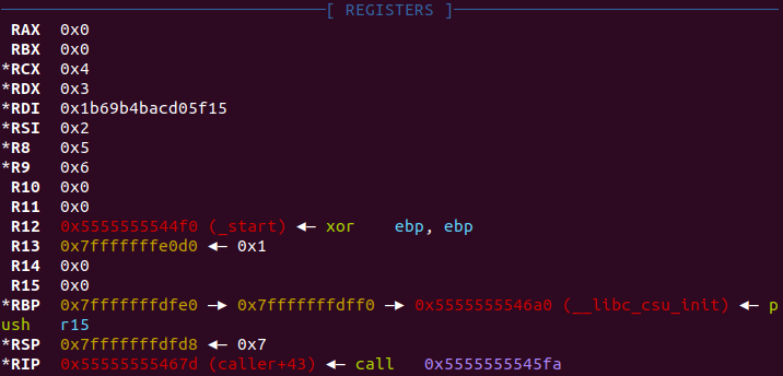 RDI, RSI, RDX, RCX, R8, R9에 1번째 인자부터 6번째 인자까지 설정된 것을 확인할 수 있다.