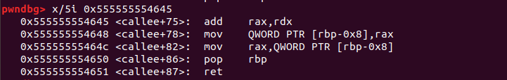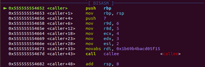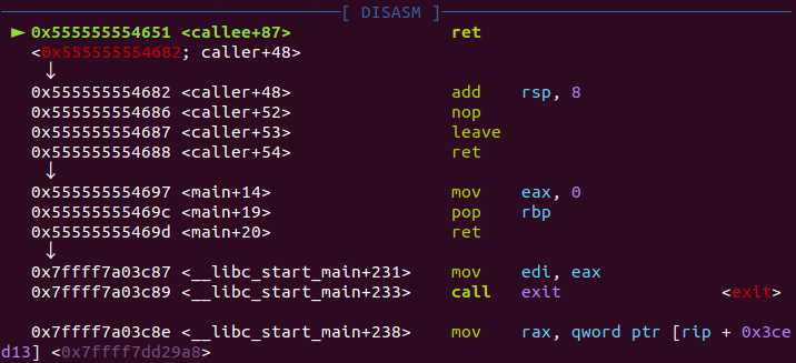 0x0000555555554682이 바로 반환 주소이고, 해당 위치를 확인해보면 callee호출 다음 명령어의 주소인 것을 알 수 있다.