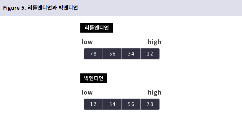 | 리틀 엔디언 | 데이터의 Most Significant Byte(MSB; 가장 왼쪽의 바이트)가 가장 높은 주소에 저장 |