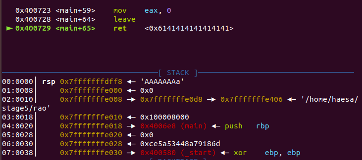위 예제는 scanf("%s", buf);로 입력을 받기 때문에 입력을 길게 준다면 함수의 반환 주소를 덮어쓸 수 있을 것이다.