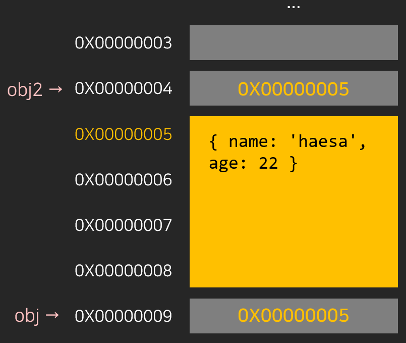 objμλ μ€λΈμ νΈμ κ° κ·Έ μμ²΄κ° ν λΉλλκ² μλλΌ μ€λΈμ νΈκ° μ μ₯λ λ©λͺ¨λ¦¬μ μ£Όμ, μ¦ μ°Έμ‘°κ°μ΄ ν λΉλλ€.