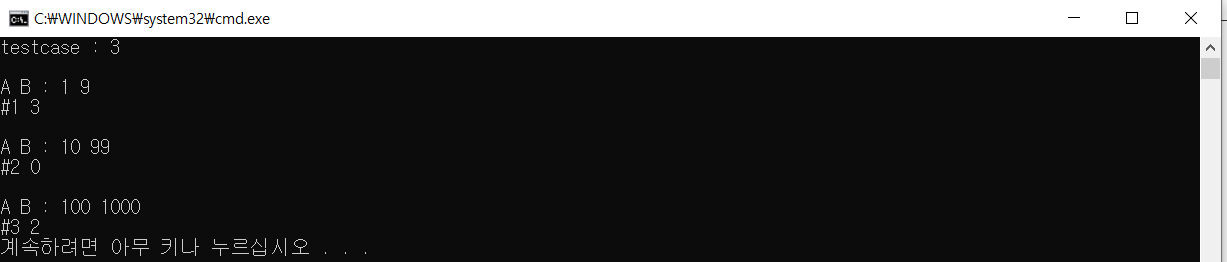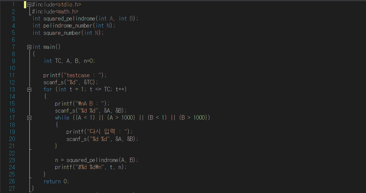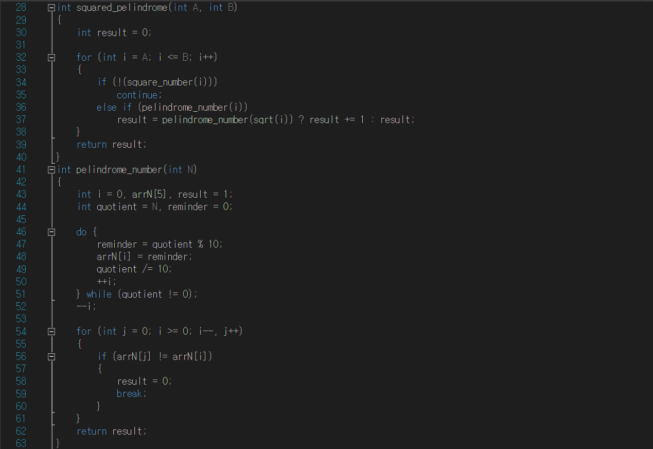main함수에서 A와 B를 인자로 받는다. for문으로 i를 A부터 B까지 증가시켜 A와 B사이의 모든 수를 검사한다. 제곱 팰린드롬 수는 제곱근도 팰린드롬 수여야 하기 때문에 i가 제곱수가 아니면 제곱 팰린드롬 수가 아니다. 따라서 if문에서 i가 제곱수가 아니면 현재 반복을 건너뛴다. i가 제곱수이면 else if문에서 pelindrome_number함수로 i가 팰린드롬 수인지 아닌지 확인한다. 참이면 i의 제곱근도 pelindrome_number함수로 팰린드롬 수인지 아닌지 확인한다. 이때 pelindrome_number(sqrt(i))가 참이면 result가 1증가하고, 거짓이면 값의 변동이 없다.