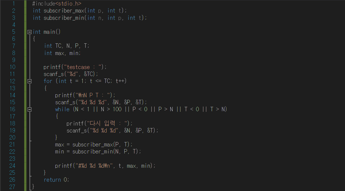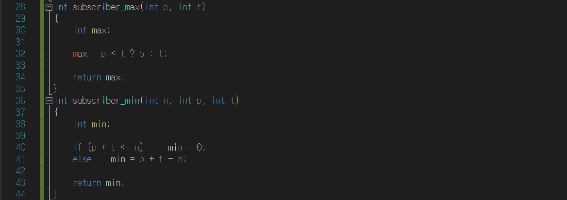 두 채널 모두 구독한 구독자의 최대값은 P채널 구독자와 T채널 구독자 중 더 작은 값에 해당한다. 따라서 main으로 부터 P채널 구독자와 T채널 구독자 값을 가져오고, 조건 연산자를 사용해서 p와 t중 더 작은 값을 max에 저장한다. p와 t가 같은 경우에는 t의 값이 max에 저장되지만 둘 다 같은 값이므로 상관하지 않는다.