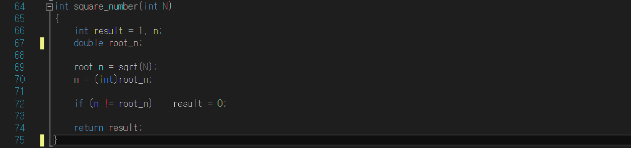 square_pelindrome함수에서 검사하는 수가 제곱수인지 확인할 때 사용한다. sqrt함수를 사용해서 N의 제곱근을 root_n에 구하고, root_n을 int로 캐스팅한 값을 n에 저장했다.(sqrt함수는 double자료형을 반환) 그 후 if문으로 n과 root_n을 비교해서 값이 다르면 result에 0을 대입한다. 여기서 result가 1이면 N은 제곱수이고, 0이면 제곱수가 아니다.