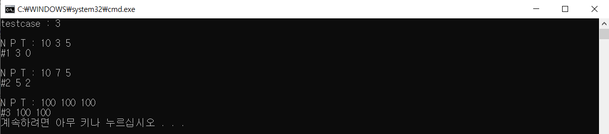 두 채널 모두 구독한 구독자 수가 최소이려면 한 사람이 최대한 한 채널만 구독하도록 해야 한다. P채널과 T채널을 구독한 구독자 수를 합하고 이를 N보다 큰지 작은지를 따진다. 만약 N보다 작다거나 같다면 모든 사람이 두 채널을 동시에 구독할 수 없게 배치할 수 있다. 따라서 이 경우는 min이 0이 된다. 만약 N보다 크다면 P채널 구독자와 T채널 구독자 수를 합한 다음 N을 빼야한다. p+t-n에서 남은 값만큼 두 채널을 동시에 구독한 구독자 수가 있다는 뜻이므로 이 경우 min은 p+t-n이다.