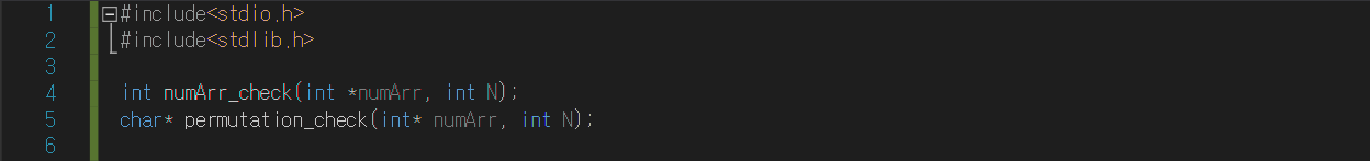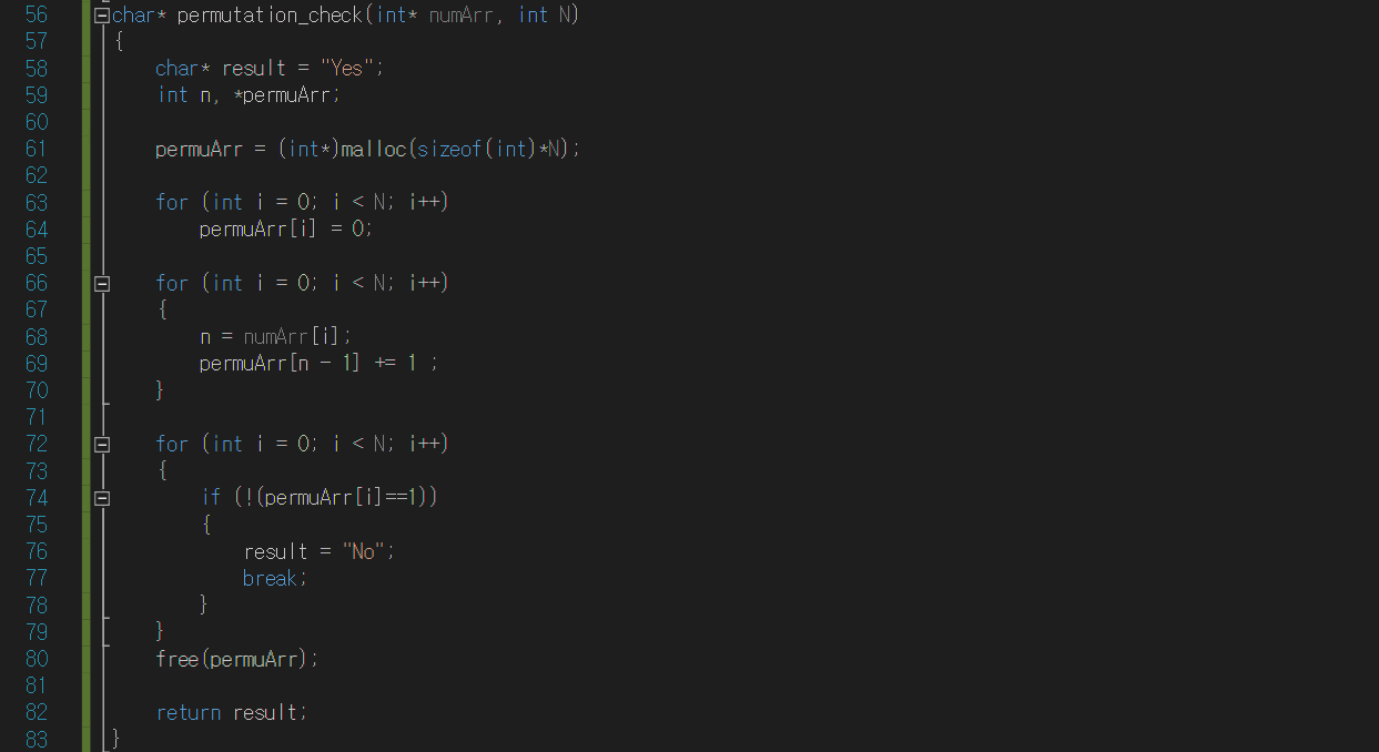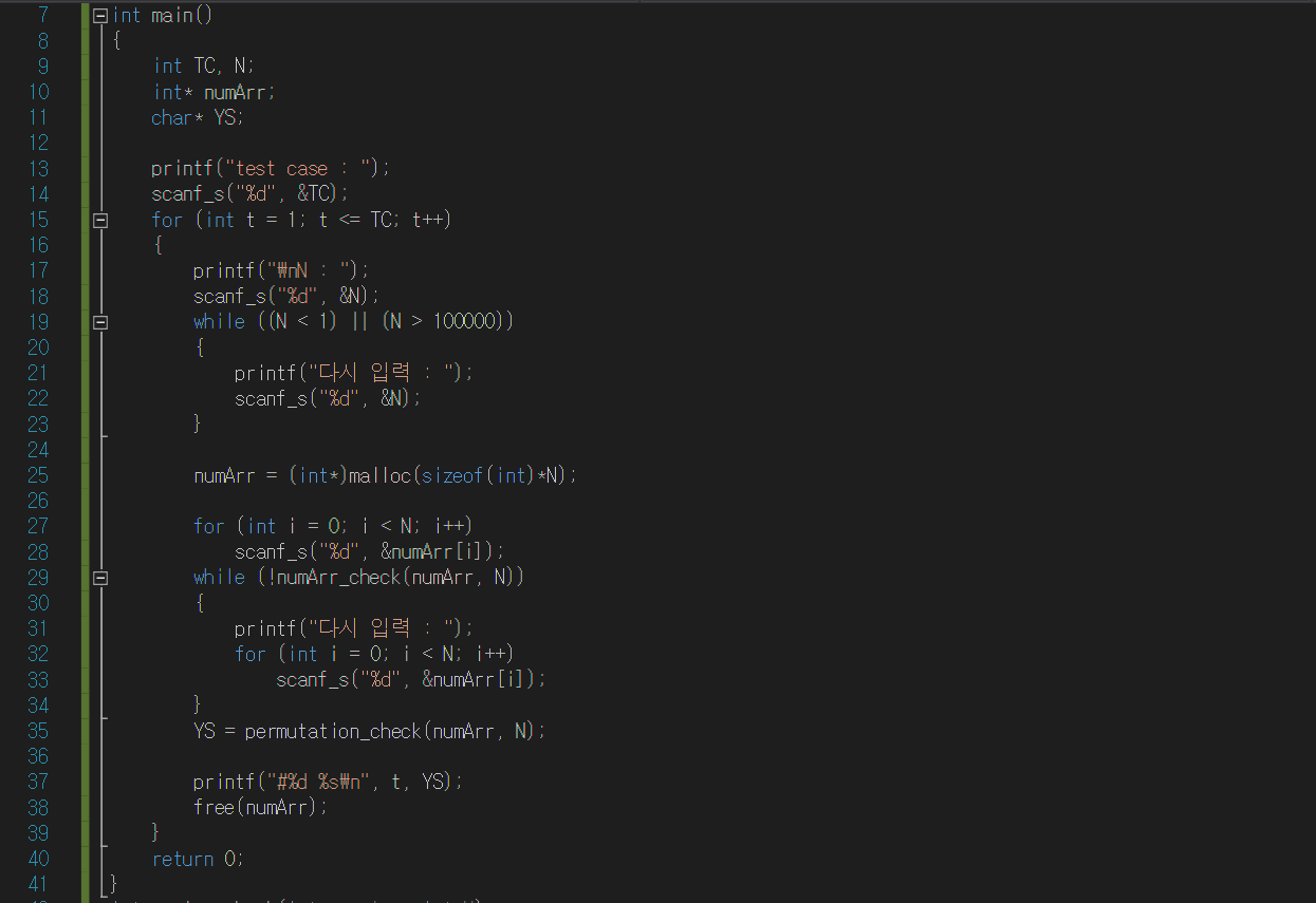 permutation_check함수로 numArr에 저장된 N개의 숫자가 N의 순열인지 확인하고, 그 결과를 YS에 반환한다.