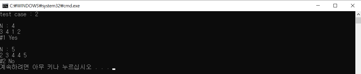 모든 permuArr의 값이 1이어야 numArr이 N의 순열이 되므로 permuArr이 1이 아닌경우 No를 반환하고, 모두 1인 경우 Yes를 반환한다.