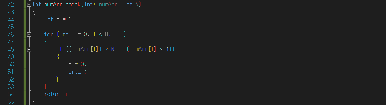 for문에서 i가 0부터 N전까지 증가하면서 numArr에 N개의 숫자를 입력 받고, while문에서 numArr_check함수로 N개의 숫자가 0이상 N이하인지 확인한다.