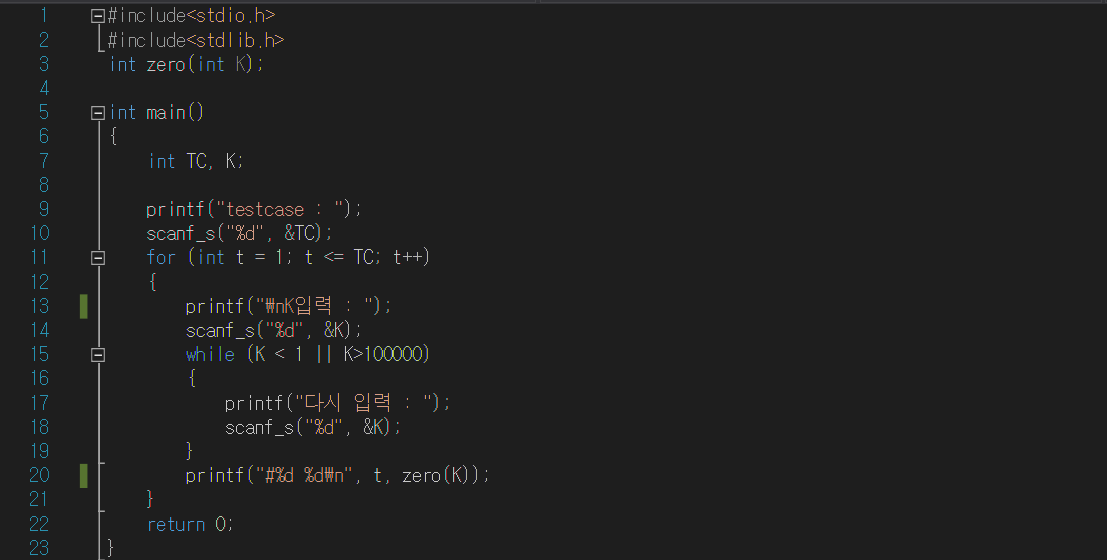 K를 zero함수로 전달하고, 반환값을 테스트케이스 번호와 함께 출력한다.